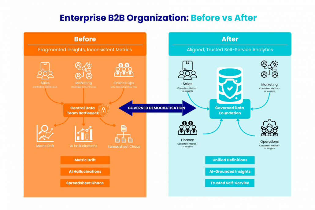 In enterprise B2B environments, self-service analytics drives speed but only governance sustains trust.